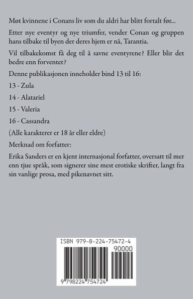 Møt kvinnene i Conans liv som du aldri har blitt fortalt før... Etter nye eventyr og nye triumfer, vender Conan og gruppen hans tilbake til byen der deres hjem er nå, Tarantia. Vil tilbakekomst få deg til å savne eventyrene? Eller blir det bedre enn forventet? Denne publikasjonen inneholder bind 13 til 16: 13 - Zula 14 - Alatariel 15 - Valeria 16 - Cassandra (Alle karakterer er 18 år eller eldre) Merknad om forfatter: Erika Sanders er en kjent internasjonal forfatter, oversatt til mer enn tjue språk, som signerer sine mest erotiske skrifter, langt fra sin vanlige prosa, med pikenavnet sitt.