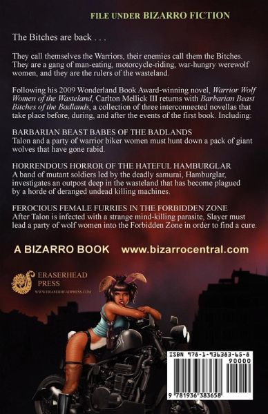 The Bitches are back . . . They call themselves the Warriors, their enemies call them the Bitches. They are a gang of man-eating, motorcycle-riding, war-hungry werewolf women, and they are the rulers of the wasteland. Following his 2009 Wonderland Book Award-winning novel, Warrior Wolf Women of the Wasteland, Carlton Mellick III returns with Barbarian Beast Bitches of the Badlands, a collection of three interconnected novellas that take place before, during, and after the events of the first book. Including: BARBARIAN BEAST BABES OF THE BADLANDS Talon and a party of warrior biker women must hunt down a pack of giant wolves that have gone rabid. HORRENDOUS HORROR OF THE HATEFUL HAMBURGLAR A band of mutant soldiers led by the deadly samurai, Hamburglar, investigates an outpost deep in the wasteland that has become plagued by a horde of deranged undead killing machines. FEROCIOUS FEMALE FURRIES IN THE FORBIDDEN ZONE After Talon is infected with a strange mind-killing parasite, Slayer must lead a party of wolf women into the Forbidden Zone in order to find a cure.