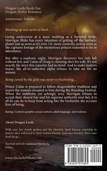 "What do you get when you mix a curious investigative reporter with a hot Alien Dragon-Shifter Prince? My kind of book! You guys, I LOVE this novel--Michelle M Pillow's world building is first rate which is a must for great sci-fi!" - Evangeline Anderson, NYT & USAT bestselling author Once mated, these shifters will do anything to protect the women they love! With over 1,000 five-star Goodreads ratings: When reporter Morrigan takes an undercover assignment on a foreign planet, she ends up the accidental bride of a dragon shifter. Prince Ualan is determined to honor the marriage - but first, he'll have to tame the tempestuous beauty! (BookBub) The original Dragon Lords series' Anniversary Edition by NYT Bestselling Author, Michelle M. Pillow. Breaking up is hard to do... Going undercover at a mass wedding as a bartered bride, Morrigan Blake has every intention of getting off the barbaric alien planet just as soon as the ceremony is over. Or, more correctly, just as soon as she captures footage of the mysterious princes rumored to be in attendance. After a euphoric night, Morrigan discovers her ride left without her and an alien dragon shifter is claiming she's his wife. It's not exactly the story this reporter had in mind. And to make matters worse, the all-to-seductive dragon prince refuses to give up without a fight. Being cursed by the gods was never so frustrating... Prince Ualan is prepared to follow dragon shifter tradition and marry the woman revealed to him during the marriage festival. When the stubborn, yet achingly sexy, Morrigan refuses to accept their shared fate, it is all he can do to keep from acting like the barbarian she accuses him of being. About the Dragon Lords Series The dragon-shifting alien princes have no problem with commitment. In one night, these alpha males will meet and choose their fated mates in a simplistic ceremony involving the removing of masks and the crushing of crystals. With few words spoken and the shortest, most bizarre courtship in history, they will bond to their women forever. A Qurilixen World Novel Dragon Shapeshifter Paranormal, Science Fiction, Fantasy, Alien Romance Revised Expanded Anniversary Edition