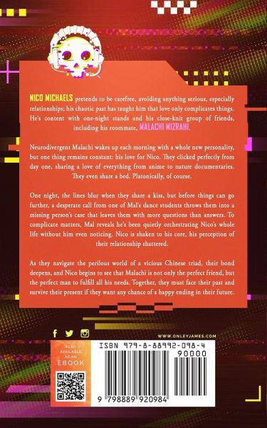 Nico Michaels pretends to be carefree, avoiding anything serious, especially relationships; his chaotic past has taught him that love only complicates things. He's content with one-night stands and his close-knit group of friends, including his roommate, Malachi Mizrahi. Neurodivergent and gender-fluid, Malachi wakes up each morning with a whole new personality, but one thing remains constant: his love for Nico. They clicked perfectly from day one, sharing a love of everything from anime to nature documentaries. They even share a bed. Platonically, of course. One night, the lines blur when they share a kiss, but before things can go further, a desperate call from one of Mal's dance students throws them into a missing person's case that leaves them with more questions than answers. To complicate matters, Mal reveals he's been quietly orchestrating Nico's whole life without him even noticing. Nico is shaken to his core, his perception of their relationship shattered. As they navigate the perilous world of a vicious Chinese triad, their bond deepens, and Nico begins to see that Malachi is not only the perfect friend, but the perfect man to fulfill all his needs. Together, they must face their past and survive their present if they want any chance of a happy ending in their future.