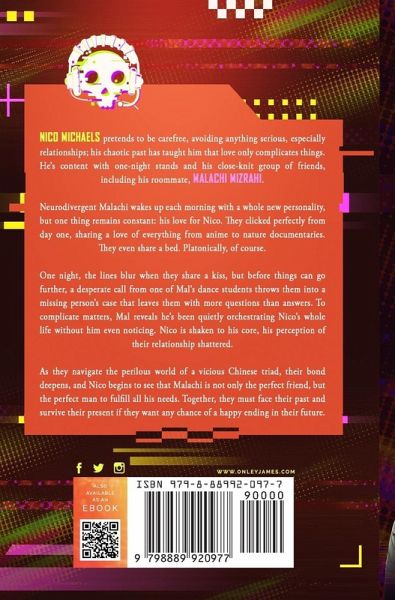 Nico Michaels pretends to be carefree, avoiding anything serious, especially relationships; his chaotic past has taught him that love only complicates things. He's content with one-night stands and his close-knit group of friends, including his roommate, Malachi Mizrahi. Neurodivergent and gender-fluid, Malachi wakes up each morning with a whole new personality, but one thing remains constant: his love for Nico. They clicked perfectly from day one, sharing a love of everything from anime to nature documentaries. They even share a bed. Platonically, of course. One night, the lines blur when they share a kiss, but before things can go further, a desperate call from one of Mal's dance students throws them into a missing person's case that leaves them with more questions than answers. To complicate matters, Mal reveals he's been quietly orchestrating Nico's whole life without him even noticing. Nico is shaken to his core, his perception of their relationship shattered. As they navigate the perilous world of a vicious Chinese triad, their bond deepens, and Nico begins to see that Malachi is not only the perfect friend, but the perfect man to fulfill all his needs. Together, they must face their past and survive their present if they want any chance of a happy ending in their future.
