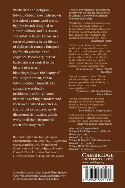 The fourth volume of Barbarism and Religion, which focuses on eighteenth-century Europe.'Barbarism and Religion' - Edward Gibbon's own phrase - is the title of a sequence of works by John Pocock designed to situate Gibbon, and his Decline and Fall of the Roman Empire, in a series of contexts in the history of eighteenth-century Europe. In the fourth volume in the sequence, first published in 2005, Pocock argues that barbarism was central to the history of western historiography, to the history of the Enlightenment, and to Edward Gibbon himself. As a concept it was deeply problematic to Enlightened historians seeking to understand their own civilised societies in the light of exposure to newly discovered civilisations which were, until then, beyond the reach of history itself.