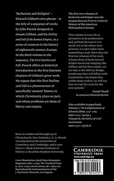 'Barbarism and Religion' - Edward Gibbon's own phrase - is the title of a sequence of works by John Pocock designed to situate Gibbon, and his Decline and Fall of the Roman Empire, in a series of contexts in the history of eighteenth-century Europe. This is a major intervention from one of the world's leading historians, challenging the notion of any one 'Enlightenment' and positing instead a plurality of enlightenments, of which the English was one. The first two volumes of Barbarism and Religion were warmly and widely reviewed, and won the Jacques Barzun Prize in Cultural History of the American Philosophical Society. In this third volume in the sequence, The First Decline and Fall, John Pocock offers an historical introduction to the first fourteen chapters of Gibbon's great work, recounting the end of the classical civilisation Gibbon and his readers knew so much better than the worlds that followed.