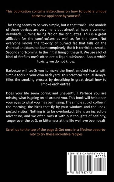 This publication contains instructions on how to build a unique barbecue appliance by yourself. This thing seems to be very simple, but is that true? . The models of these devices are very many but almost all have a common drawback. Burning falling fat on the briquettes. This is a great affliction for the constructors as well as for the users. Not everyone knows the toxicity of burned fat that falls on the charcoal and does not burn completely. But it is terrible to smoke. Second shortcoming. In the initial firing of the grill. We use a lot of kind of fireflies most often are a liquid substance. About which toxicity we do not know. Barbecue will teach you to make the finest smoked feasts with simple tools in your own back yard. This practical manual demystifies the smoking process by describing in great detail how to smoke each entrée. Does your life seem boring and uneventful? Perhaps you are missing what is going on all around you. This book will help open your eyes to what you may be missing. The simple cup of coffee in the morning, the birds that fly by your window, and the unexpected visitor. Nothing is to be overlooked. Life is an incredible adventure, and we often miss it with our thoughts of self-pity, anger over the past, or bitterness at the life we have been dealt Scroll up to the top of the page & Get once in a lifetime opportunity to try these incredible recipes