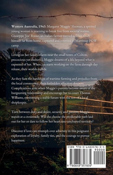 When war tears a family apart, can love bring it together? Western Australia, 1943: Spirited Maggie Sleeman yearns to break free from societal norms. Giuseppe 'Joe' Russo, an Italian farmer-turned-soldier, finds himself far from home, captured and interned in Marrinup POW camp. Amidst wartime hardships and prejudice, a forbidden bond forms. Torn between duty and desire, security and passion, Maggie stands at a crossroads: Will she choose the predictable path laid out for her or dare to follow her heart into uncharted territory? Discover if love can triumph over adversity in this poignant exploration of loyalty, family ties, and the courage to pursue happiness.