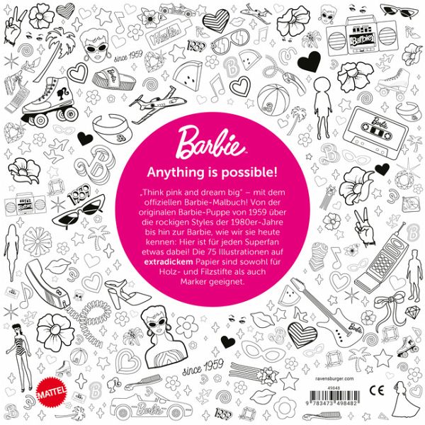 Unter dem Motto "Anything is possible!" inspiriert Barbie Mädchen und Frauen seit 1959 - von der ersten Barbie-Puppe im schwarz-weißen Badeanzug über Barbie als Astronautin bis hin zu den modernen Barbie-Puppen. In diesem Malbuch erleben Fans von Barbie eine Reise durch die Vergangenheit. Beim Ausmalen von 75 stylischen Motiven im Retro-Look werden die bekanntesten Barbie-Puppen zum Leben erweckt. Auf dem dicken, hochwertigen Papier können Holz-, Filz- und auch andere Stifte genutzt werden.
