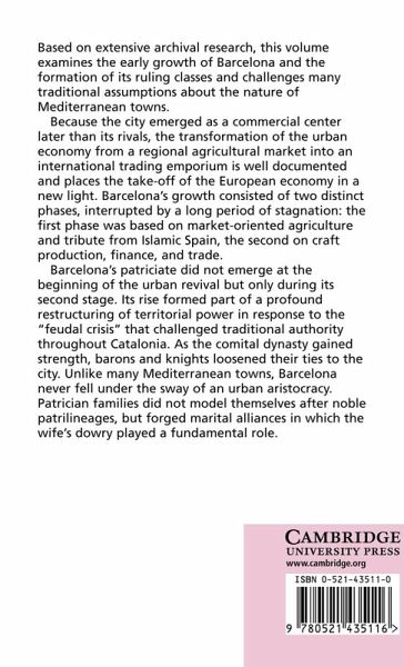 This volume examines the early growth of Barcelona and the formation of its ruling classes. The city did not at first grow because of overseas trade but because of market-oriented agriculture and tribute from Islamic Spain. Only after a difficult adjustment did the city develop the commercial foundations which would later ensure its prosperity. Barcelona's patriciate rose to prominence during the second stage of growth, its rise forming part of a profound restructuring of territorial power in response to the 'feudal crisis' that challenged traditional authority throughout Catalonia. Patrician families did not model themselves after noble patrilineages, but forged marital alliances in which the wife's dowry played a fundamental role. In this new book the family structure of the patriciate receives close examination and many traditional assumptions about the nature of Mediterranean towns are challenged.