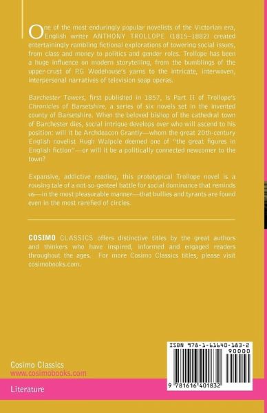 One of the most enduringly popular novelists of the Victorian era, English writer ANTHONY TROLLOPE (1815-1882) created entertainingly rambling fictional explorations of towering social issues, from class and money to politics and gender roles. Trollope has been a huge influence on modern storytelling, from the bumblings of the upper-crust of P.G Wodehouse's yarns to the intricate, interwoven, interpersonal narratives of television soap operas. Barchester Towers, first published in 1857, is Part II of Trollope's Chronicles of Barsetshire, a series of six novels set in the invented county of Barsetshire. When the beloved bishop of the cathedral town of Barchester dies, social intrigue develops over who will ascend to his position: will it be Archdeacon Grantly-whom the great 20th-century English novelist Hugh Walpole deemed one of "the great figures in English fiction"-or will it be a politically connected newcomer to the town? Expansive, addictive reading, this prototypical Trollope novel is a rousing tale of a not-so-genteel battle for social dominance that reminds us-in the most pleasurable manner-that bullies and tyrants are found even in the most rarefied of circles.