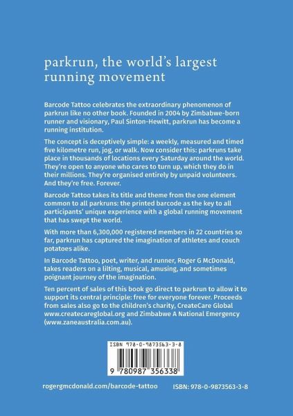Barcode Tattoo is a collection of prose and poetry that takes its title and theme from the one element common to all parkruns: the printed barcode as the key to all participants' unique experience with this global running movement.