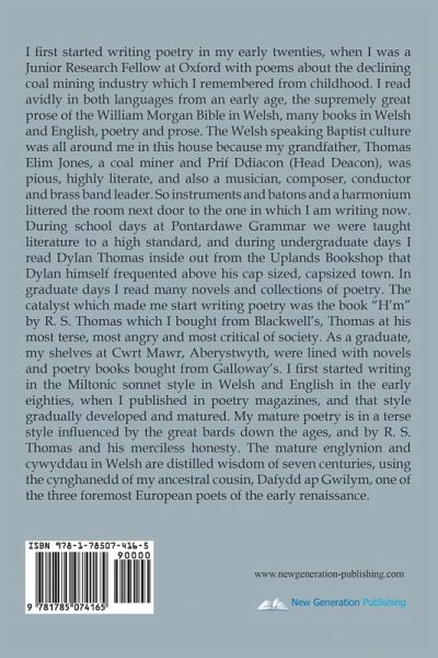 I first started writing poetry in my early twenties, when I was a Junior Research Fellow at Oxford with poems about the declining coal mining industry which I remembered from childhood. I read avidly in both languages from an early age, the supremely great prose of the William Morgan Bible in Welsh, many books in Welsh and English, poetry and prose. The Welsh speaking Baptist culture was all around me in this house because my grandfather, Thomas Elim Jones, a coal miner and Prif Ddiacon (Head Deacon), was pious, highly literate, and also a musician, composer, conductor and brass band leader. So instruments and batons and a harmonium littered the room next door to the one in which I am writing now. During school days at Pontardawe Grammar we were taught literature to a high standard, and during undergraduate days I read Dylan Thomas inside out from the Uplands Bookshop that Dylan himself frequented above his cap sized, capsized town. In graduate days I read many novels and collections of poetry. The catalyst which made me start writing poetry was the book "H'm" by R. S. Thomas which I bought from Blackwell's, Thomas at his most terse, most angry and most critical of society. As a graduate, my shelves at Cwrt Mawr, Aberystwyth, were lined with novels and poetry books bought from Galloway's. I first started writing in the Miltonic sonnet style in Welsh and English in the early eighties, when I published in poetry magazines, and that style gradually developed and matured. My mature poetry is in a terse style influenced by the great bards down the ages, and by R. S. Thomas and his merciless honesty. The mature englynion and cywyddau in Welsh are distilled wisdom of seven centuries, using the cynghanedd of my ancestral cousin, Dafydd ap Gwilym, one of the three foremost European poets of the early renaissance.
