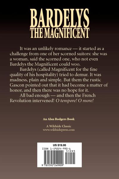 It was an unlikely romance -- it started as a challenge from one of her scorned suitors: she was a woman, said the scorned one, who not even Bardelys the Magnificent could woo. Bardelys (called Magnificent for the fine quality of his hospoitality) tried to demur. It was madness, plain and simple. But them the rustic Gascon pointed out that it had become a matter of honor, and then there was no hope for it. All bad enoough -- and then the French Revolution intervened! O tempore! O more!