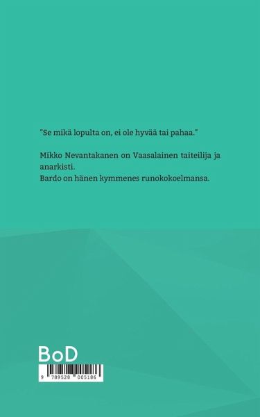 "Se mikä lopulta on, ei ole hyvää tai pahaa." Mikko Nevantakanen on Vaasalainen taiteilija ja anarkisti. Bardo on hänen kymmenes runokokoelmansa.