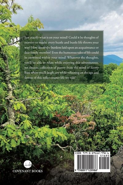 Just exactly what is on your mind? Could it be thoughts of eternity or maybe every hustle and bustle life throws your way? How about the burdens laid upon an acquaintance or dear family member? Even the humorous tales of life could be entwined within your mind! Whatever the thoughts, you'll be able to relate while enjoying this adventurous, yet sincere, collection of poetry from the mind of Scotty Bare where you'll laugh, cry while reflecting on the ups and downs of this roller-coaster life we ride!