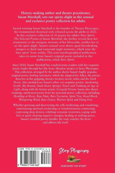History-making author and theatre practitioner, Susan Marshall, sets our spirits alight in this sensual and exclusive poetry collection for adults. Award-winning Susan Marshall is the founder of Theatre Playscapes, her monumental theatrical style released across the globe in 2023. In this exclusive collection of 30 poems for adults: Bare Spirit: The Selected Poems of Susan Marshall, she further reveals how her attunement to the energetic motions of her lifeworlds, enables her to set the spirit alight. Susan's sensual verse draws upon breathtaking imagery to distil and transcend single moments, which arise the 'bare spirit' from within. This semi-autobiographical publication takes its name from Susan's original poem, included in this publication, titled: Bare Spirit. Since 2020, Susan Marshall has touched many readers with her exquisite poetic études through her My Story Meadow project at Story Playscapes. This collection, arranged by the author, shares Susan's highly popular, original poem: Seeking Sanctuary, which she adapted for Adira, the private detective in her gripping, literary mystery novel: Adira and the Dark Horse. Also included are Susan's other very popular poems: Awakening North, Sky Bound, Dusk Heart, Spring's Touch and Trekking an Age of Light, along with the feature poem: Evergold Dream. Susan also shares stunning, unreleased poems from her personal poetry collection, including: Shedding at Shore, Raw Flute, Bare Nocturne, Spirit Tree, Road Block, Whispering Wind, Bare Desire, Warrior Spirit and Flying Free. Whether growing and discovering the self; meditating and visualising; experiencing spiritual awakening or transformation; connecting; expressing deep desires; relishing romantic moments; coping with loss or grief; clearing negative energies; healing or seeking peace, Susan's mindful poetry kindles the soul, touches the heart and affirms life itself.