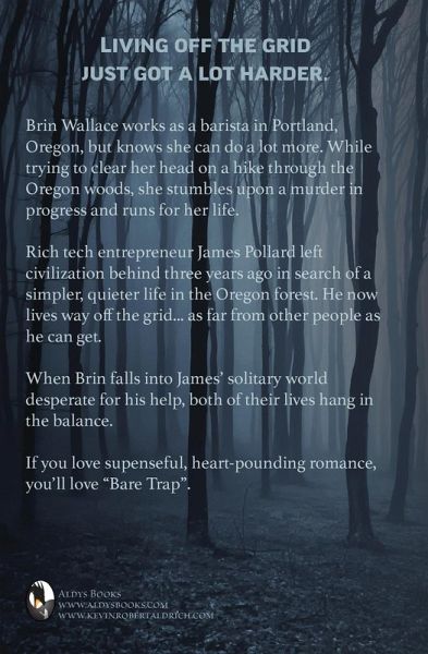Living off the grid just got a lot harder. Brin Wallace works as a barista in Portland, but knows she can do a lot more. While trying to clear her head on a hike through the Oregon woods, she stumbles upon a murder in progress and runs for her life. Rich tech entrepreneur James Pollard left civilization behind three years ago in search of a simpler, quieter life in the Oregon forest. He now lives off the grid... as far from other people as he can get. When Brin falls into James' solitary world, desperate for his help, both of their lives hang in the balance. If you love suspenseful, heart-pounding romance, you'll love "Bare Trap".