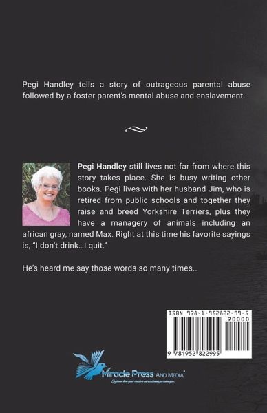 Pegi Handley tells a story of outrageous parental abuse followed by a foster parent's mental abuse and enslavement. Pegi Handley still lives not far from where this story takes place. She is busy writing other books. Pegi lives with her husband Jim, who is retired from public schools and together they raise and breed Yorkshire Terriers, plus they have a managery of animals including an African gray, named Max. Right at this time his favorite sayings is, "I don't drink...I quit." He's heard me say those words so many times...