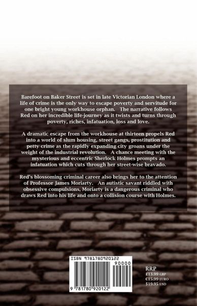 Barefoot on Baker Street is set in late Victorian London where a life of crime is the only way to escape poverty and servitude for one bright young workhouse orphan. The narrative follows Red on her incredible life-journey as it twists and turns through poverty, riches, infatuation, loss and love. A dramatic escape from the workhouse at thirteen propels Red into a world of slum housing, street gangs, prostitution and petty crime as the rapidly expanding city groans under the weight of the industrial revolution. A chance meeting with the mysterious and eccentric Sherlock Holmes prompts an infatuation which cuts through her street-wise bravado. Red's blossoming criminal career also brings her to the attention of Professor James Moriarty. An autistic savant riddled with obsessive compulsions, Moriarty is a dangerous criminal who draws Red into his life and onto a collision course with Holmes.