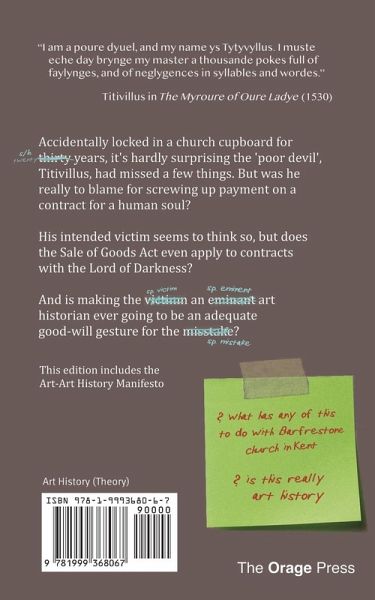 Accidentally locked in a church cupboard for twenty years, it's hardly surprising the 'poor devil', Titivillus, had missed a few things. But was he really to blame for screwing up payment on a contract for a human soul? His intended victim seems to think so, but does the Sale of Goods Act even apply to contracts with the Lord of Darkness? And is making the victim into an eminent art historian ever going to be an adequate good-will gesture for the mistake? More to the point, what has any of this to do with Barfrestone church in Kent and is this still art history? This edition includes the Art-Art History Manifesto.