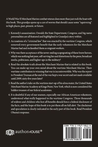 A World War II Merchant Marine combat veteran does more than just rock the boat with this book. This grandpa opens up a can of worms that should cause some "squirming" in high places, past, present, or future. 1. Kennedy’s assassination, Oswald, the State Department, Congress, and big name personalities are all featured and highlighted in Grandpa’s story within. 2. Accusations of a "criminal law" that was enacted by the wartime Congress, which removed every government benefit that the early volunteers for the Merchant Marine had and reclassified them as migrant workers. 3. Why was there acceptance of the never-ending scapegoating of these brave heroes, which was nothing but pure, self-serving lies and distortions by the press, broadcast media, politicians, and higher-ups in the military? 4. Read the absolute truth about the Merchant Marine that is related in this book. You can make up your own mind about the wartime Merchant Marine. Their wartime contribution to winning that war is incontrovertible. Why was the report to President Truman at the end of the war kept a war secret and not made available until 2009, sixty-five years later? 5. Read the author’s take on the wartime start-up of his alma mater, the United States Merchant Marine Academy at Kings Point, New York, which is now considered the hidden treasure of our federal academies. 6. It is doubtful if any of our seamen, especially our African American volunteers, understood what really happened in the wartime Congress. Those thousands of widows and children who lost all benefits should force a federal disclosure of the facts, and the hope of this book is to put them all on full alert. The disclaimer and speculation is clearly indicated in the early part of this book. Read President Obama’s response.