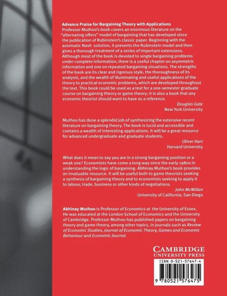 Graduate textbook presenting abstract models of bargaining in a unified framework with detailed applications involving economic, political and social situations.
