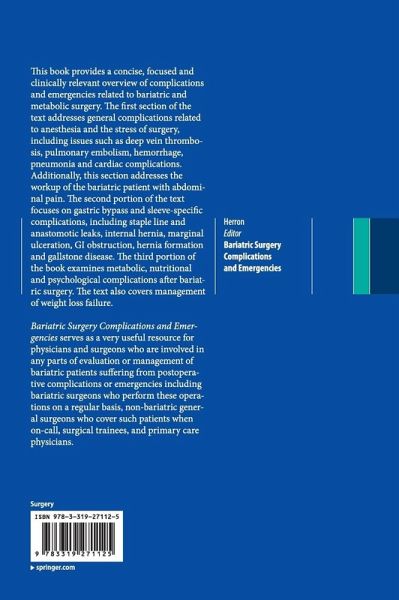 "It is designed to be a thorough guide to complications in the postoperative care of bariatric surgery patients. ... The intended audience includes bariatric surgeons and the entire team. ... This is a strong addition to the bariatric literature. It provides an excellent review of standards of care and the studies which have led to improvements in care." (Luke Kinsinger, Doody's Book Reviews, July, 2016)