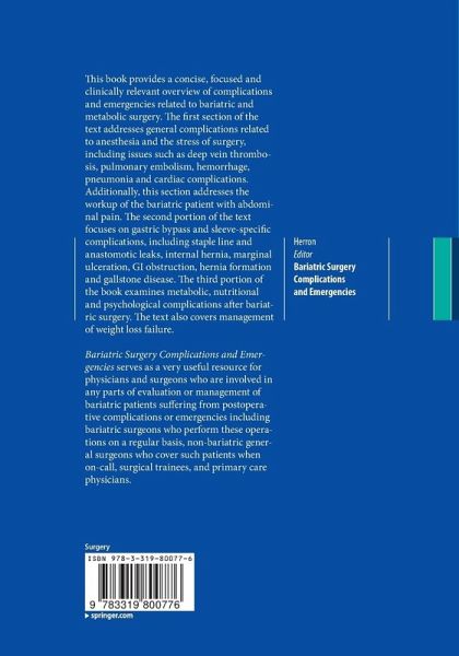 "It is designed to be a thorough guide to complications in the postoperative care of bariatric surgery patients. ... The intended audience includes bariatric surgeons and the entire team. ... This is a strong addition to the bariatric literature. It provides an excellent review of standards of care and the studies which have led to improvements in care." (Luke Kinsinger, Doody's Book Reviews, July, 2016)