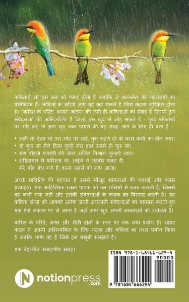 The book, Barish ke Parinday, is an endless journey of emotions of all seasons of life. Every word of the book will give way to the hidden emotions of the readers. The author has expressed himself honestly and has painted his poetry with true colours of his life. All readers will have an experience as if the book is written by themselves and feel the Shair in each word of his poetry. Aaina ban kar tere aks ko chu jaunga, Ek parchai sa har mausam mein sath aunga