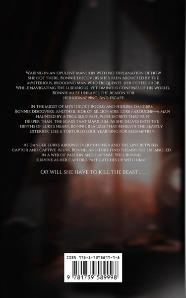 Waking in an opulent mansion with no explanation, Bonnie discovers she's been abducted by the mysterious, brooding man who frequents her coffee shop. While navigating the luxurious yet ominous confines of his world, Bonnie is determined to unravel the reason for her kidnapping. And escape. In the midst of mysterious rooms and hidden dangers, Bonnie discovers another side of billionaire, Luke Farouche-a man haunted by a troubled past, with secrets that run deeper than the scars that mark him. As Bonnie delves into the depths of Luke's heart, she realizes that beneath the beastly exterior lies a tortured soul yearning for redemption. As danger lurks around every corner and the line between captor and captive blurs, Bonnie and Luke find themselves entangled in a web of passion and suspense. Will Bonnie survive as her captor's past catches up with him? Or will she have to kill the beast . . .