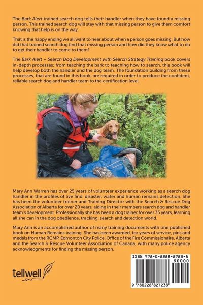 The Bark Alert trained search dog tells their handler when they have found a missing person. The Bark Alert search dog stays with that missing person to give them comfort knowing that help is on the way. That is the happy ending we all want to hear about when a person goes missing. But how did that Bark Alert search dog find that missing person and how did they know what to do to get their handler to come to them? The Bark Alert-Search Dog Development with Search Strategy training book covers in-depth processes; from teaching the bark to teaching how to search this book helps develop both the handler and the dog team. The foundation building from these processes, that are found in this book, are required in order to produce the confident, reliability search dog and handler team to the certification level.