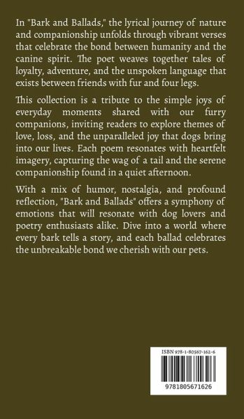 In "Bark and Ballads," the lyrical journey of nature and companionship unfolds through vibrant verses that celebrate the bond between humanity and the canine spirit. The poet weaves together tales of loyalty, adventure, and the unspoken language that exists between friends with fur and four legs. This collection is a tribute to the simple joys of everyday moments shared with our furry companions, inviting readers to explore themes of love, loss, and the unparalleled joy that dogs bring into our lives. Each poem resonates with heartfelt imagery, capturing the wag of a tail and the serene companionship found in a quiet afternoon. With a mix of humor, nostalgia, and profound reflection, "Bark and Ballads" offers a symphony of emotions that will resonate with dog lovers and poetry enthusiasts alike. Dive into a world where every bark tells a story, and each ballad celebrates the unbreakable bond we cherish with our pets.