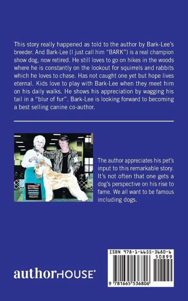 This story really happened as told to the author by Bark-Lee's breeder. And Bark-Lee (I just call him "BARK") is a real champion show dog, now retired. He still loves to go on hikes in the woods where he is constantly on the lookout for squirrels and rabbits which he loves to chase. Has not caught one yet but hope lives eternal. Kids love to play with Bark-Lee when they meet him on his daily walks. He shows his appreciation by wagging his tail in a "blur of fur". Bark-Lee is looking forward to becoming a best selling canine co-author.
