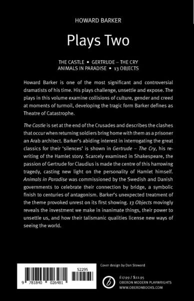 Includes the plays The Castle, Gertrude - The Cry, Animals in Paradise and 13 Objects. Howard Barker is one of the most significant and controversial dramatists of his time. His plays challenge, unsettle and expose. The plays in this volume examine collisions of culture, gender and creed at moments of turmoil, developing the tragic form Barker defines as Theatre of Catastrophe. The Castle is set at the end of Crusades and describes the clashes that occur when returning soldiers bring an Arab architect home with them as a prisoner. Barker's abiding interest in interrogating the great classics for their 'silences' is shown in Gertrude - The Cry, his re-writing of the Hamlet story. Scarcely examined in Shakespeare, the passion of Gertrude for Claudius is made the centre of this harrowing tragedy, casting new light on the personality of Hamlet himself. Animals in Paradise was commissioned by the Swedish and Danish governments to celebrate their connection by bridge, a symbolic finish to centuries of antagonism. Barker's unexpected treatment of the theme provoked unrest on its first showing. 13 Objects movingly reveals the investment we make in inanimate things, their power to unsettle us, and how their talismanic qualities license new ways of seeing the world.