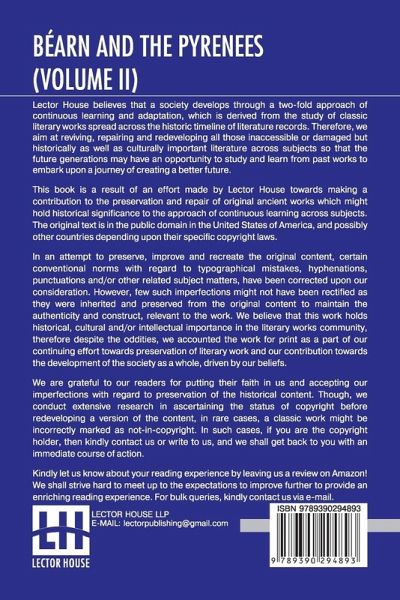 Béarn And The Pyrenees (Volume II): A Legendary Tour To The Country Of Henri Quatre. (In Two Volumes - Vol. II.) This book is a result of an effort made by us towards making a contribution to the preservation and repair of original classic literature. In an attempt to preserve, improve and recreate the original content, we have worked towards: 1. Type-setting & Reformatting: The complete work has been re-designed via professional layout, formatting and type-setting tools to re-create the same edition with rich typography, graphics, high quality images, and table elements, giving our readers the feel of holding a 'fresh and newly' reprinted and/or revised edition, as opposed to other scanned & printed (Optical Character Recognition - OCR) reproductions. 2. Correction of imperfections: As the work was re-created from the scratch, therefore, it was vetted to rectify certain conventional norms with regard to typographical mistakes, hyphenations, punctuations, blurred images, missing content/pages, and/or other related subject matters, upon our consideration. Every attempt was made to rectify the imperfections related to omitted constructs in the original edition via other references. However, a few of such imperfections which could not be rectified due to intentional\unintentional omission of content in the original edition, were inherited and preserved from the original work to maintain the authenticity and construct, relevant to the work. We believe that this work holds historical, cultural and/or intellectual importance in the literary works community, therefore despite the oddities, we accounted the work for print as a part of our continuing effort towards preservation of literary work and our contribution towards the development of the society as a whole, driven by our beliefs. We are grateful to our readers for putting their faith in us and accepting our imperfections with regard to preservation of the historical content. HAPPY READING!