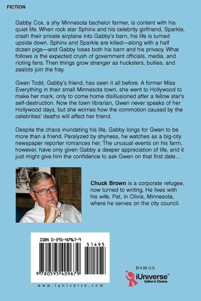 Gabby Cox, a shy Minnesota bachelor farmer, is content with his quiet life. When rock star Sphinx and his celebrity girlfriend, Sparkle, crash their private airplane into Gabby's barn, his life is turned upside down. Sphinx and Sparkle are killed-along with a half dozen pigs-and Gabby loses both his barn and his privacy. What follows is the expected crush of government officials, media, and rioting fans. Then things grow stranger as hucksters, bullies, and zealots join the fray. Gwen Todd, Gabby's friend, has seen it all before. A former Miss Everything in their small Minnesota town, she went to Hollywood to make her mark, only to come home disillusioned after a fellow star's self-destruction. Now the town librarian, Gwen never speaks of her Hollywood days, but she worries how the commotion caused by the celebrities' deaths will affect her friend. Despite the chaos inundating his life, Gabby longs for Gwen to be more than a friend. Paralyzed by shyness, he watches as a big-city newspaper reporter romances her. The unusual events on his farm, however, have only given Gabby a deeper appreciation of life, and it just might give him the confidence to ask Gwen on that first date.