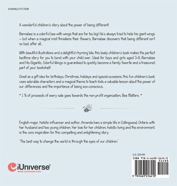 A wonderful children's story about the power of being different! Barnabee is a colorful bee with wings that are far too big! He's always tried to hide his giant wings - but when a magical mist threatens their flowers, Barnabee discovers that being different isn't so bad, after all... With beautiful illustrations and a delightful rhyming tale, this lovely children's book makes the perfect bedtime story for you to bond with your child over. Ideal for boys and girls aged 3-6, Barnabee and His Gigantic, Colorful Wings is guaranteed to quickly become a family favorite and a treasured part of your…mehr