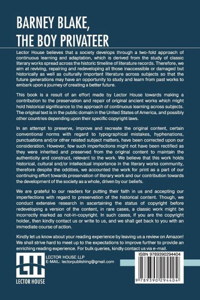 Barney Blake, The Boy Privateer: Or, The Cruise Of The Queer Fish. This book is a result of an effort made by us towards making a contribution to the preservation and repair of original classic literature. In an attempt to preserve, improve and recreate the original content, we have worked towards: 1. Type-setting & Reformatting: The complete work has been re-designed via professional layout, formatting and type-setting tools to re-create the same edition with rich typography, graphics, high quality images, and table elements, giving our readers the feel of holding a 'fresh and newly' reprinted and/or revised edition, as opposed to other scanned & printed (Optical Character Recognition - OCR) reproductions. 2. Correction of imperfections: As the work was re-created from the scratch, therefore, it was vetted to rectify certain conventional norms with regard to typographical mistakes, hyphenations, punctuations, blurred images, missing content/pages, and/or other related subject matters, upon our consideration. Every attempt was made to rectify the imperfections related to omitted constructs in the original edition via other references. However, a few of such imperfections which could not be rectified due to intentional\unintentional omission of content in the original edition, were inherited and preserved from the original work to maintain the authenticity and construct, relevant to the work. We believe that this work holds historical, cultural and/or intellectual importance in the literary works community, therefore despite the oddities, we accounted the work for print as a part of our continuing effort towards preservation of literary work and our contribution towards the development of the society as a whole, driven by our beliefs. We are grateful to our readers for putting their faith in us and accepting our imperfections with regard to preservation of the historical content. HAPPY READING!