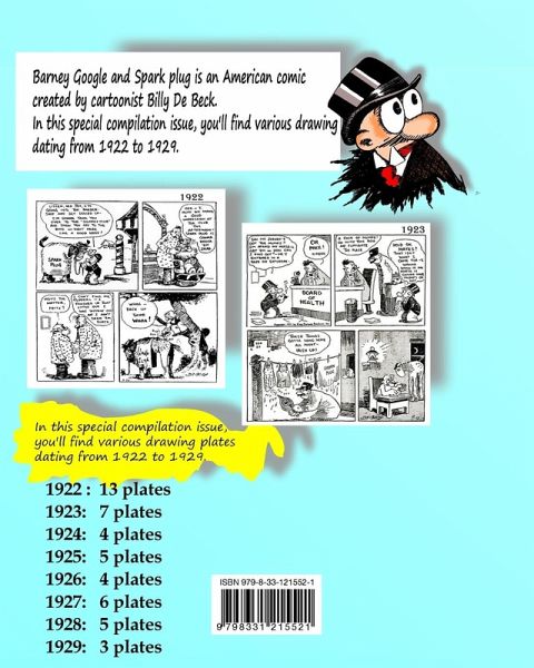 In this never before edited compilation, fourty seven plates from the adventures of Barney Google and Spark Plug. Adventures between 1922 and 1947. Of course, these are the drawings of the famous cartoonist Billy De Beck. Here,republished by Comic Books Restore.