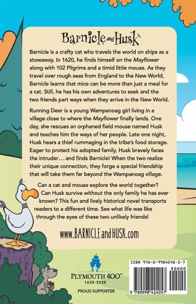 Barnicle is a crafty cat who travels the world on ships as a stowaway. In 1620, he finds himself on the Mayflower along with 102 Pilgrims and a timid little mouse. As they travel over rough seas from England to the New World, Barnicle learns that mice can be more than just a meal for a cat. Still, he has his own adventures to seek and the two friends part ways when they arrive in the New World. Running Deer is a young Wampanoag girl living in a village close to where the Mayflower finally lands. One day, she rescues an orphaned field mouse named Husk and teaches him the ways of her people. Late one night, Husk hears a thief rummaging in the tribe's food storage. Eager to protect his adopted family, Husk bravely faces the intruder . . . and finds Barnicle! When the two realize their unique connection, they forge a special friendship that will take them far beyond the Wampanoag village. Can a cat and mouse explore the world together? Can Husk survive without the only family he has ever known? This fun and lively historical novel transports readers to a different time. See what life was like through the eyes of these two unlikely friends!