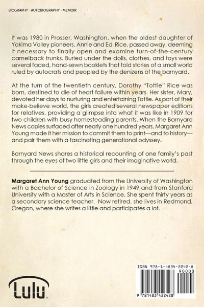It was 1980 in Prosser, Washington, when the oldest daughter of Yakima Valley pioneers, Annie and Ed Rice, passed away, deeming it necessary to finally open and examine turn-of-the-century camelback trunks. Buried under the dolls, clothes, and toys were several faded, hand-sewn booklets that told stories of a small world ruled by autocrats and peopled by the denizens of the barnyard. At the turn of the twentieth century, Dorothy "Tottie" Rice was born, destined to die of heart failure within years. Her sister, Mary, devoted her days to nurturing and entertaining Tottie. As part of their make-believe world, the girls created several newspaper editions for relatives, providing a glimpse into what it was like in 1909 for two children with busy homesteading parents. When the Barnyard News copies surfaced after nearly one hundred years, Margaret Ann Young made it her mission to commit them to print-and to history-and pair them with a fascinating generational odyssey.