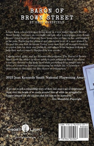 A stage play inspired by true events written by Eric Mansfield. Lenny King, a homeless man living alone in a tent under Akron's Brown Street bridge, becomes an overnight celebrity after a newspaper story details Lenny's kind heart in forgiving three teens who set him on fire and laughed at his pain. Enduring the physical and emotional scars of a man abused by life and his own bad decisions, Lenny must now fend off strangers looking to exploit him for their own publicity and others from his past looking to help him and reconnect. (Inspired by true events.) Light-hearted, gritty, and yet dramatically poignant, The Baron of Brown Street turns the tables on those quick to pass judgment based on where someone chooses to lay their head while providing deep insight into the heart of a man torn between continuing his simple life of homeless depression or choosing one last chance at redemption.