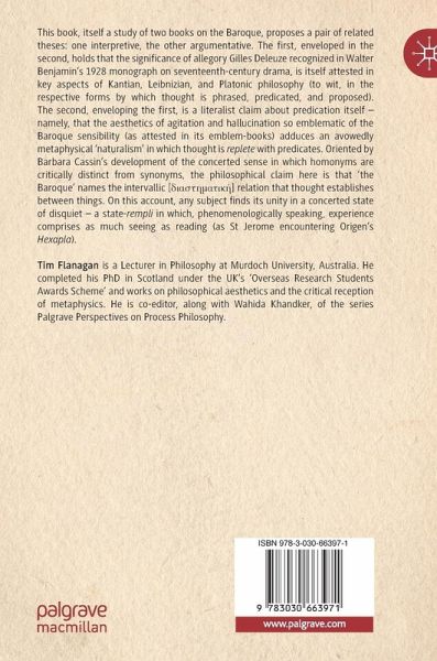 This book, itself a study of two books on the Baroque, proposes a pair of related theses: one interpretive, the other argumentative. The first, enveloped in the second, holds that the significance of allegory Gilles Deleuze recognized in Walter Benjamin's 1928 monograph on seventeenth century drama is itself attested in key aspects of Kantian, Leibnizian, and Platonic philosophy (to wit, in the respective forms by which thought is phrased, predicated, and proposed).The second, enveloping the first, is a literalist claim about predication itself - namely, that the aesthetics of agitation and hallucination so emblematic of the Baroque sensibility (as attested in its emblem-books) adduces an avowedly metaphysical 'naturalism' in which thought is replete with predicates. Oriented by Barbara Cassin's development of the concerted sense in which homonyms are critically distinct from synonyms, the philosophical claim here is that 'the Baroque' names the intervallic [d s µ ] relation that thought establishes between things. On this account, any subject finds its unity in a concerted state of disquiet - a state-rempli in which, phenomenologically speaking, experience comprises as much seeing as reading (as St Jerome encountering Origen's Hexapla).