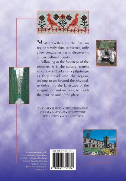 Barossa Journeys: Into a valley of tradition creates a sensory experience where the flavours of wine and food intermingle with the celebrations of festivals and music. Favourite places and enchanting, out-of-the-way sites are revealed. Explore places as evocative as the long-lost village of Hoffnungsthal, and the strange cave home of the eccentric explorer Menge. Wander through historic cemeteries and puzzle over inscriptions written in Gothic text; view traditional Fachwerk cottages and Lutheran churches. Listen to the tales of the Barossa: of the migration of Prussian refugees, the entrepreneurship of British and German winery pioneers, and the planting of Yalumba's vineyards on moonlit evenings. Follow the secret treks of the potter. The Barossa's old customs and symbols are also explained: the black Lutheran wedding dress; the tin-kettling rite; the featherstripping evenings; the pagan meanings of harvest celebrations; and the Wends and their folklore and witchcraft beliefs.