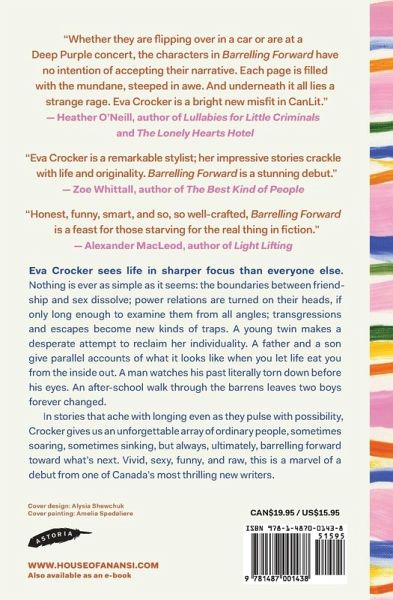 EVA CROCKER grew up in Ktaqamkuk (Newfoundland) and currently resides in Tiohti:áke (Montreal). Her debut novel All I Ask was longlisted for the 2020 Giller Prize and won the 2020 BMO Winterset Award. Her short story collection Barreling Forward was shortlisted for the Dayne Ogilvie Prize for Emerging LGBTQS2 Writers and won the Alistair MacLeod Award for Short Fiction and the CAA Emerging Author's Award. She is a PhD student in Concordia University's Interdisciplinary Humanities program.