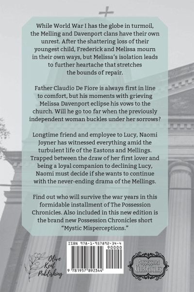 While World War I has the globe in turmoil, the Melling and Davenport clans have their own unrest. After the shattering loss of their youngest child, Frederick and Melissa mourn in their own ways, but Melissa's isolation leads to further heartache that stretches the bounds of repair. Father Claudio De Fiore is always first in line to comfort, but his moments with grieving Melissa Davenport eclipse his vows to the church. Will he go too far when the previously independent woman buckles under her sorrows? Longtime friend and employee to Lucy, Naomi Joyner has witnessed everything amid the turbulent life of the Eastons and Mellings. Trapped between the draw of her first lover and being a loyal companion to declining Lucy, Naomi must decide if she wants to continue with the never-ending drama of the Mellings. Find out who will survive the war years in this formidable installment of The Possession Chronicles. Also included in this new edition is the brand new Possession Chronicles short "Mystic Misperceptions."