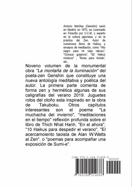 Noveno volumen de la monumental obra del poeta zen Genshin "La montaña de la iluminación". En esta nueva antología zen se comentan en forma de poemas y reflexiones algunas de sus caligrafías, y el autor se inspira en los versos del poeta japones Takuboku.