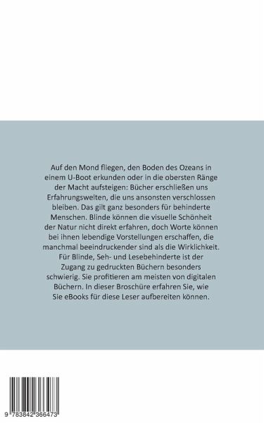 Auf den Mond fliegen, den Boden des Ozeans in einem U-Boot erkunden oder in die obersten Ränge der Macht aufsteigen: Bücher erschließen uns Erfahrungswelten, die uns ansonsten verschlossen bleiben. Das gilt ganz besonders für behinderte Menschen. Blinde können die visuelle Schönheit der Natur nicht direkt erfahren, doch Worte können bei ihnen lebendige Vorstellungen erschaffen, die manchmal beeindruckender sind als die Wirklichkeit. Für Blinde, Seh- und Lesebehinderte ist der Zugang zu gedruckten Büchern besonders schwierig. Sie profitieren am meisten von digitalen Büchern. In dieser Broschüre erfahren Sie, wie Sie eBooks für diese Leser aufbereiten können.