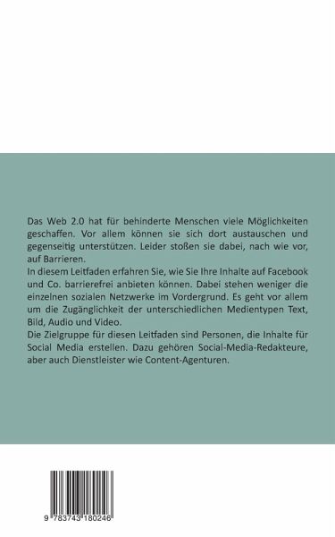 Das Web 2.0 hat für behinderte Menschen viele Möglichkeiten geschaffen. Vor allem können sie sich dort austauschen und gegenseitig unterstützen. Leider stoßen sie dabei, nach wie vor, auf Barrieren.In diesem Leitfaden erfahren Sie, wie Sie Ihre Inhalte auf Facebook und Co. barrierefrei anbieten können. Dabei stehen weniger die einzelnen sozialen Netzwerke im Vordergrund. Es geht vor allem um die Zugänglichkeit der unterschiedlichen Medientypen Text, Bild, Audio und Video.Die Zielgruppe für diesen Leitfaden sind Personen, die Inhalte für Social Media erstellen. Dazu gehören Social-Media-Redakteure, aber auch Dienstleister wie Content-Agenturen.