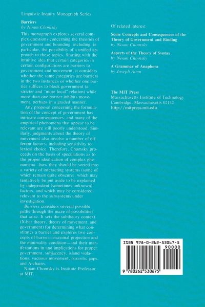 This monograph explores several complex questions concerning the theories of government and bounding, including, in particular, the possibility of a unified approach to these topics. Starting with the intuitive idea that certain categories in certain configurations are barriers to government and movement, it considers whether the same categories are barriers in the two instances or whether one barrier suffices to block government (a stricter and "more local" relation) while more than one barrier inhibits movement, perhaps in a graded manner. Any proposal concerning the formulation of the concept of government has intricate consequences, and many of the empirical phenomena that appear to be relevant are still poorly understood. Similarly, judgments about the theory of movement also involve a number of different factors, including sensitivity to lexical choice. Therefore, Chomsky proceeds on the basis of speculations as to the proper idealization of complex phenomena - how they should be sorted into a variety of interacting systems (some of which remain quite obscure), which may tentatively be put aside to be explained by independent (sometimes unknown) factors, and which may be considered relevant to the subsystems under investigation. Barriers considers several possible paths through the maze of possibilities that arise. It sets the subtheory context (x-bar theory, theory of movement, and government) for determining what constitutes a barrier and explores two concepts of barrier - maximal projection and the minimality condition - and their manifestations in and implications for proper government, subjacency, island violations, vacuous movement, parasitic gaps, and A-chains. Barriers is Linguistic Inquiry Monograph 13.