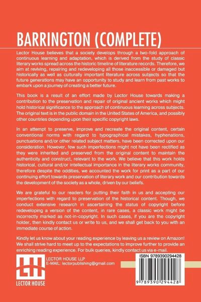 Barrington (Complete): Complete Edition Of Two Volumes This book is a result of an effort made by us towards making a contribution to the preservation and repair of original classic literature. In an attempt to preserve, improve and recreate the original content, we have worked towards: 1. Type-setting & Reformatting: The complete work has been re-designed via professional layout, formatting and type-setting tools to re-create the same edition with rich typography, graphics, high quality images, and table elements, giving our readers the feel of holding a 'fresh and newly' reprinted and/or revised edition, as opposed to other scanned & printed (Optical Character Recognition - OCR) reproductions. 2. Correction of imperfections: As the work was re-created from the scratch, therefore, it was vetted to rectify certain conventional norms with regard to typographical mistakes, hyphenations, punctuations, blurred images, missing content/pages, and/or other related subject matters, upon our consideration. Every attempt was made to rectify the imperfections related to omitted constructs in the original edition via other references. However, a few of such imperfections which could not be rectified due to intentional\unintentional omission of content in the original edition, were inherited and preserved from the original work to maintain the authenticity and construct, relevant to the work. We believe that this work holds historical, cultural and/or intellectual importance in the literary works community, therefore despite the oddities, we accounted the work for print as a part of our continuing effort towards preservation of literary work and our contribution towards the development of the society as a whole, driven by our beliefs. We are grateful to our readers for putting their faith in us and accepting our imperfections with regard to preservation of the historical content. HAPPY READING!