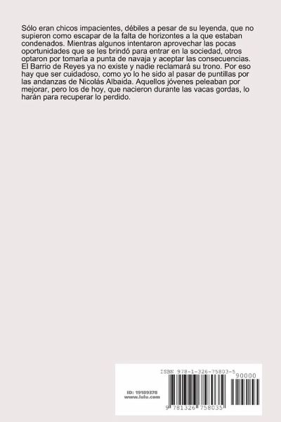 Sólo eran chicos impacientes, débiles a pesar de su leyenda, que no supieron como escapar de la falta de horizontes a la que estaban condenados. Mientras algunos intentaron aprovechar las pocas oportunidades que se les brindó para entrar en la sociedad, otros optaron por tomarla a punta de navaja y aceptar las consecuencias. El Barrio de Reyes ya no existe y nadie reclamará su trono. Por eso hay que ser cuidadoso, como yo lo he sido al pasar de puntillas por las andanzas de Nicolás Albaida. Aquellos jóvenes peleaban por mejorar, pero los de hoy, que nacieron durante las vacas gordas, lo harán para recuperar lo perdido.